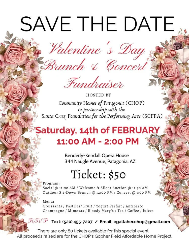 Benderly-Kendall Opera House 344 Naugle Ave, Patagonia, AZ, United StatesSupport CHOP and make a difference in our community while enjoying drinks, food and performance. Only 80 tickets available, so don’t wait! Reserve tickets by texting 520-455-7207 or email: egallaher.chop@gmail.com